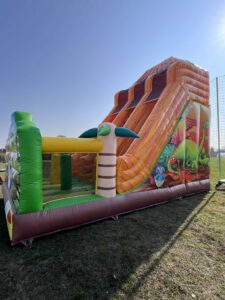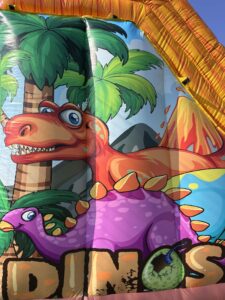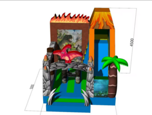 Kiadó,bérelhető családi,ünnepi rendezvényekre 6×5,4×4,8m-es Jump&Slide csúszdás Dínós ugrálóvár.
